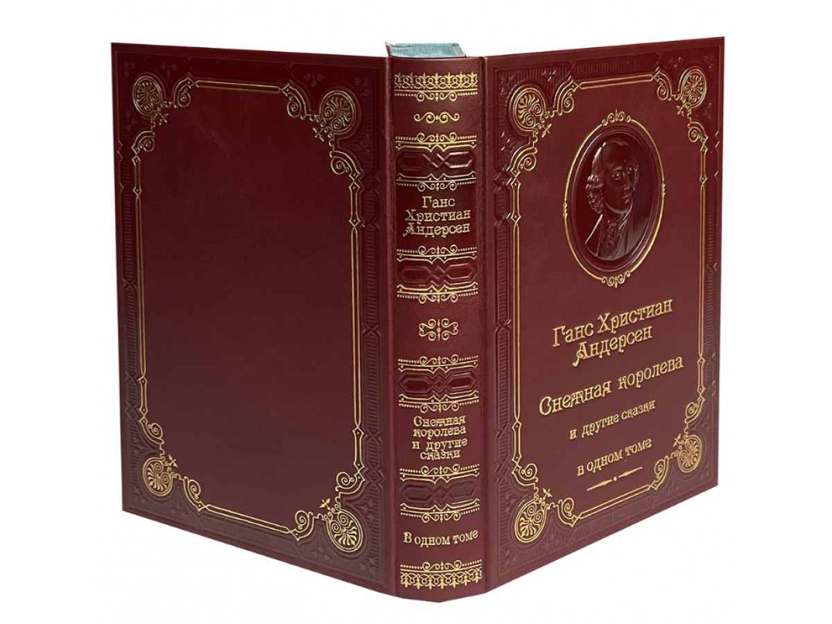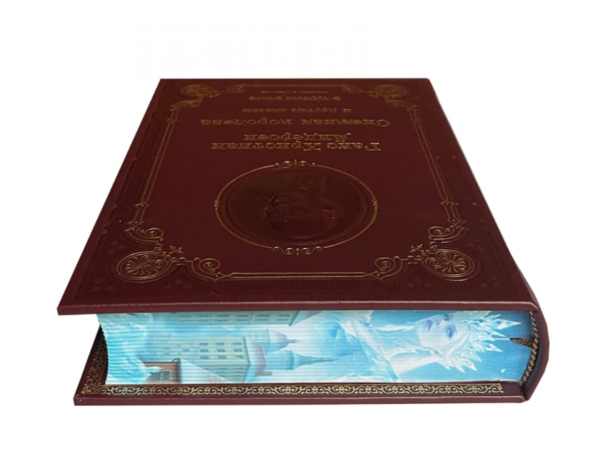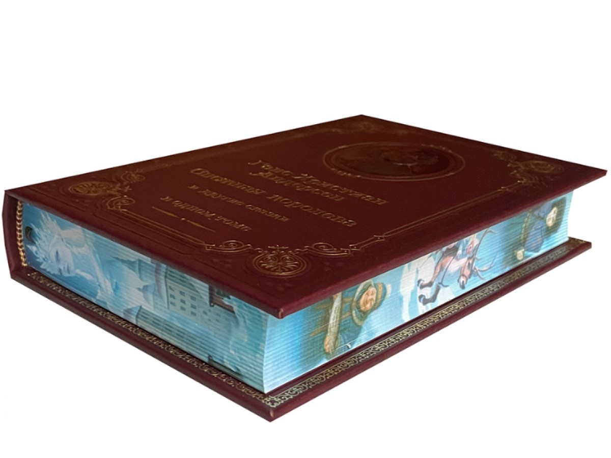 Трехсторонний обрез цветной, расписной, иллюстрирующий содержание книги, переплет ручной работы из натуральной кожи, тиснение золотой фольгой, конгревно-блинтовое глубокое тиснение (рамка), высокое конгревное тиснение (портрет автора), форзацы- дизайнерская бумага, дублюра, ляссе.
