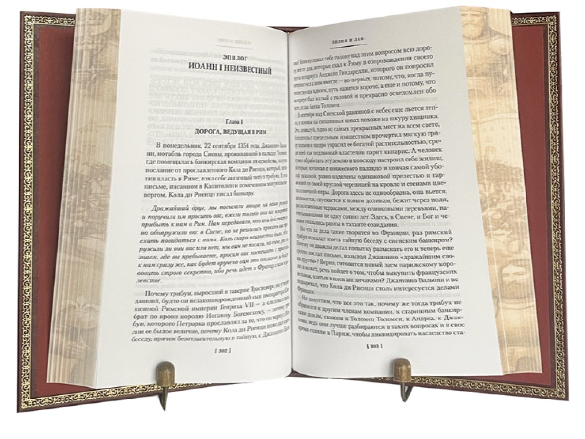 Трехсторонний обрез цветной, расписной, иллюстрирующий содержание книги, переплет ручной работы из натуральной кожи, тиснение золотой фольгой, конгревно-блинтовое глубокое тиснение (рамка), высокое конгревное тиснение (портрет автора), форзацы- дизайнерская бумага, дублюра, ляссе.