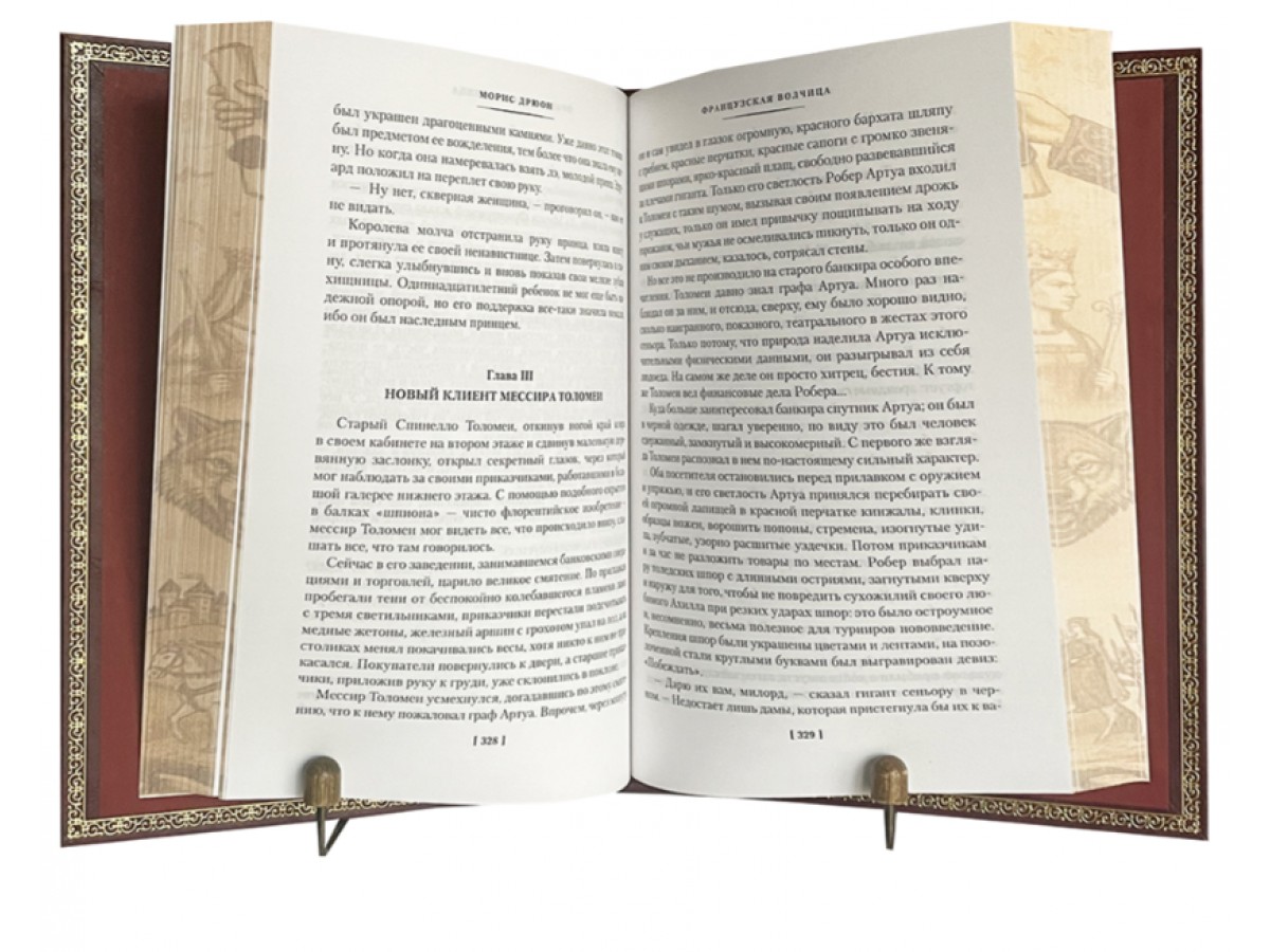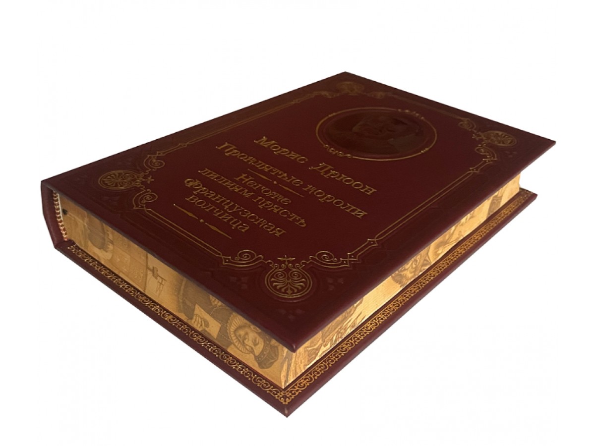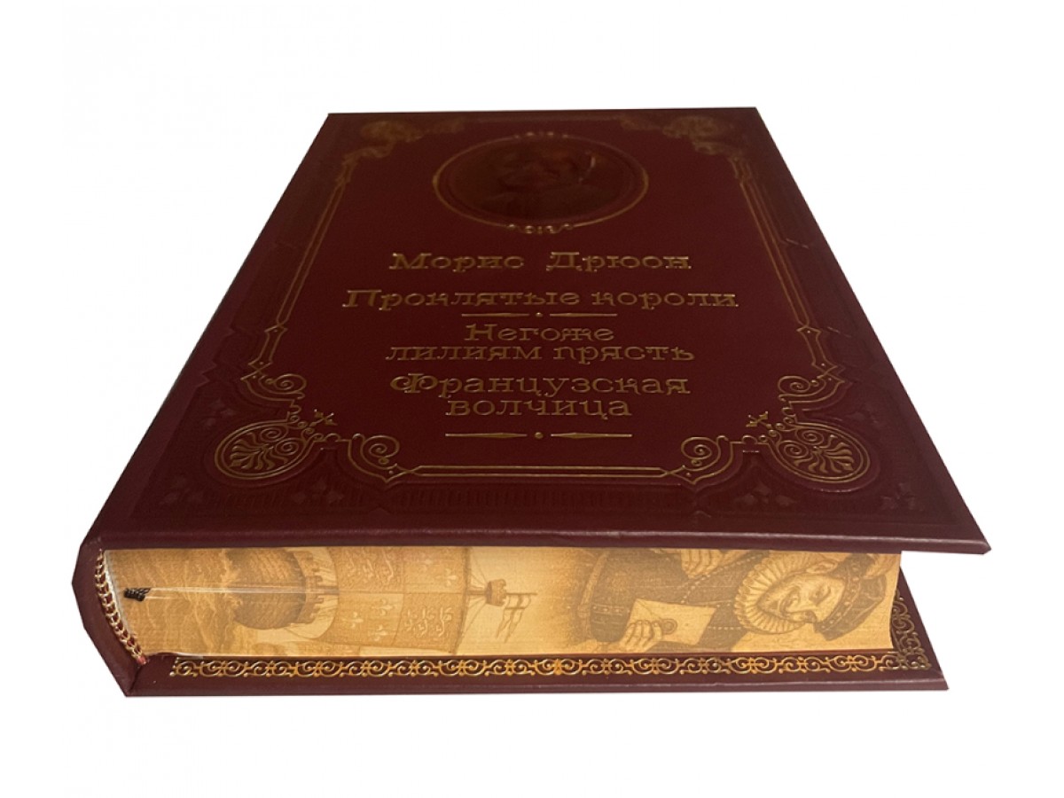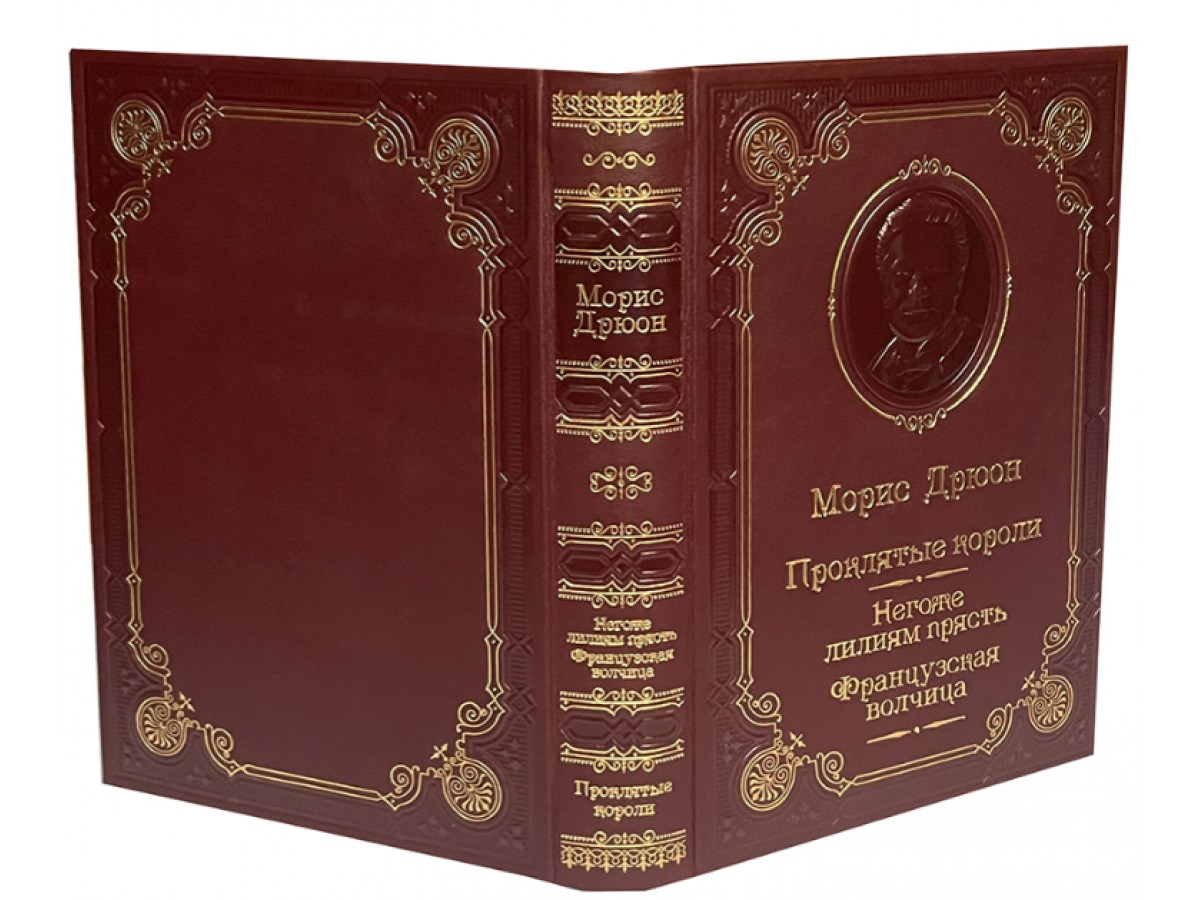 Трехсторонний обрез цветной, расписной, иллюстрирующий содержание книги, переплет ручной работы из натуральной кожи, тиснение золотой фольгой, конгревно-блинтовое глубокое тиснение (рамка), высокое конгревное тиснение (портрет автора), форзацы- дизайнерская бумага, дублюра, ляссе.