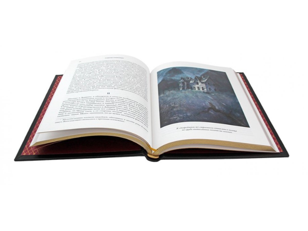 Классический европейский переплёт ручной работы из натуральной кожи. Форзац из дизайнерской бумаги Malmero с тиснением орнамента золотой фольгой. 6 бинтов на корешке, ручной обработки. Каптал золотой из натуральной кожи. Обрез блока - золото с торшонированием. Тиснение блинтовое, золотой и цветной фольгой. Ляссе.