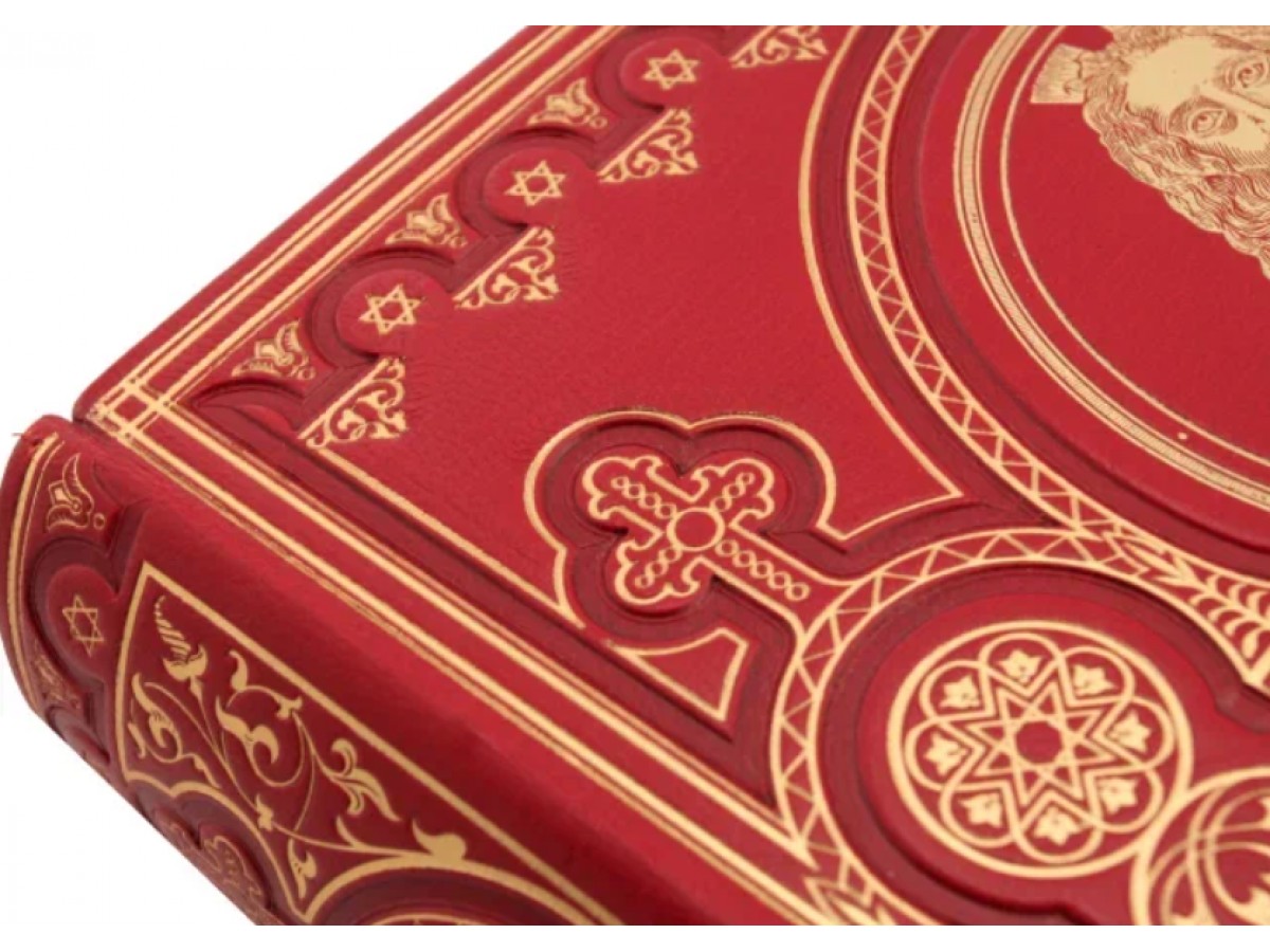 Книга исполнена по старинной французской технологии: переплет цельнокожаный, из натуральной шагрени (Франция). Бумага верже, кремовая. Блок сшит на пяти шнурах. Форзац выполнен из мраморной бумаги ручного крашения. Дублюра окатана вручную 23-каратным золотом. Обрез блока с художественным оформлением. Ляссе шелковое, каптал ручного плетения. Индивидуальный футляр.