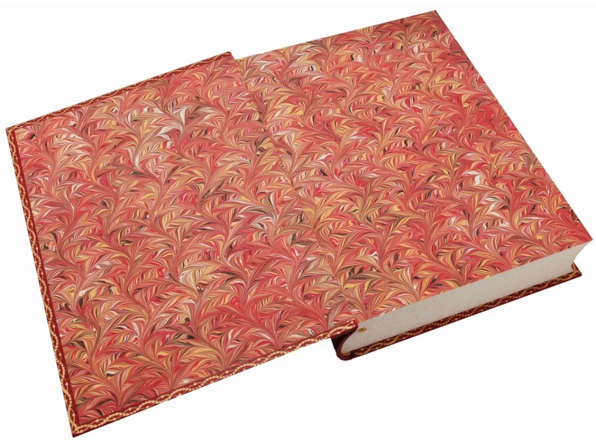 Книга исполнена по старинной французской технологии: переплет цельнокожаный, из натуральной шагрени (Франция). Бумага верже, кремовая. Блок сшит на пяти шнурах. Форзац выполнен из мраморной бумаги ручного крашения. Дублюра окатана вручную 23-каратным золотом. Обрез блока с художественным оформлением. Ляссе шелковое, каптал ручного плетения. Индивидуальный футляр.