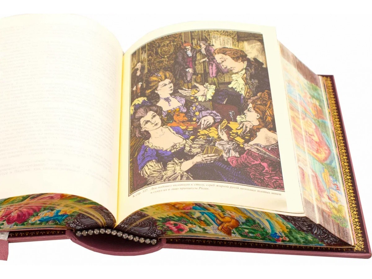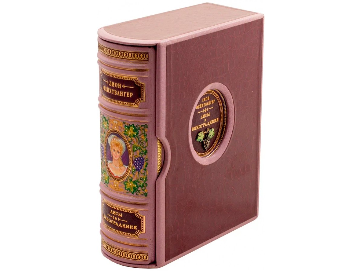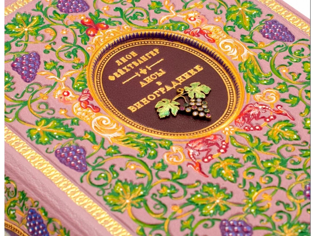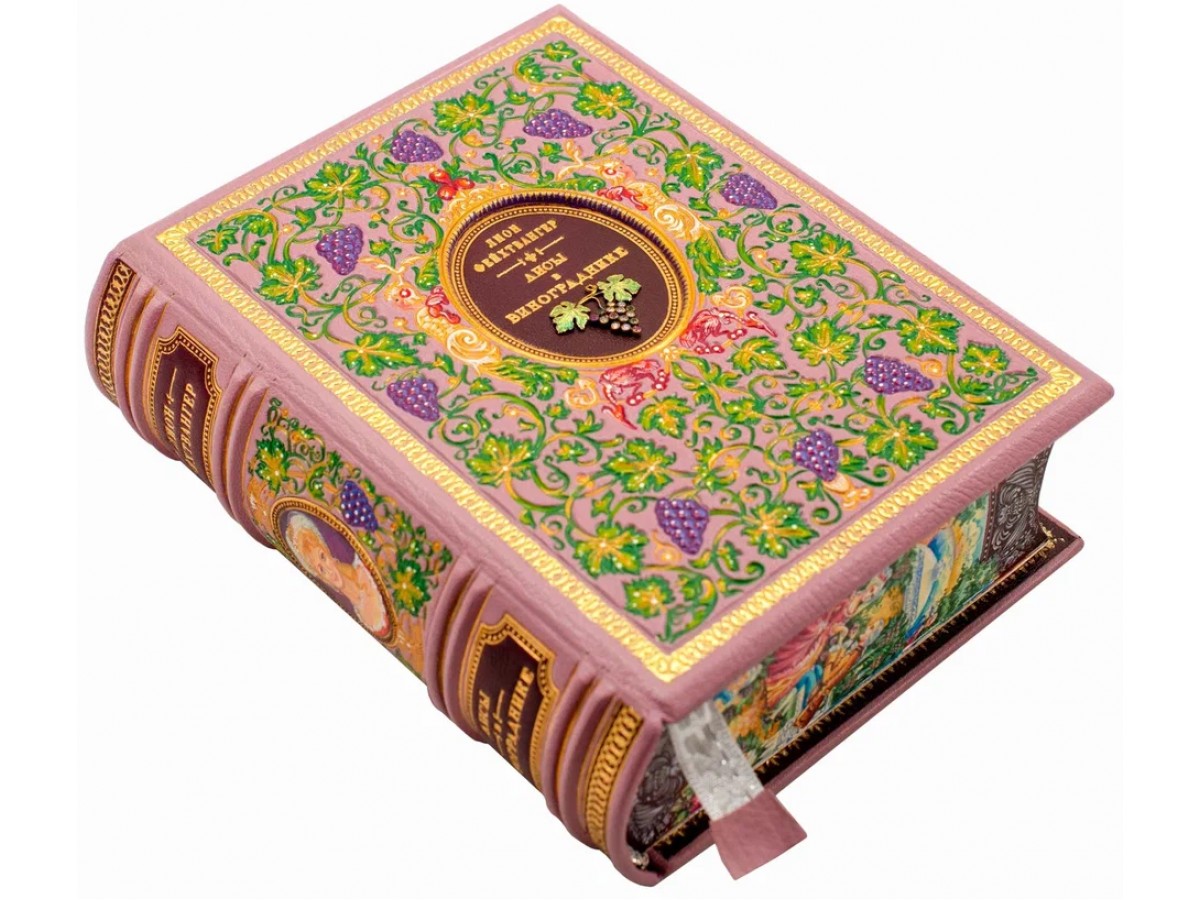 Переплет из французской кожи CHIVRE BRETEUIL. Обложка и обрез книги расписаны вручную. Тиснение на крышке произведено 24 каратным золотом. Блок напечатан на бумаге ACQUERELLO AVORIO. Иллюстрации отпечатаны на итальянской бумаге TINTORETTO CREMA. Книга инкрустирована позолоченной виноградной гроздью, изготовленной из серебра и фионитов. Шелковое дизайнерское ляссе. Каптал инкрустирован кристаллами.