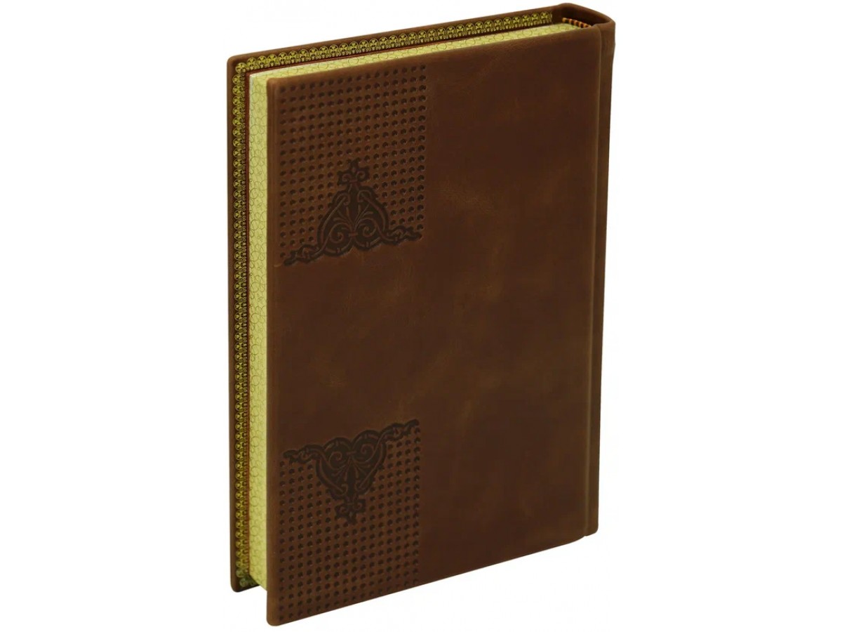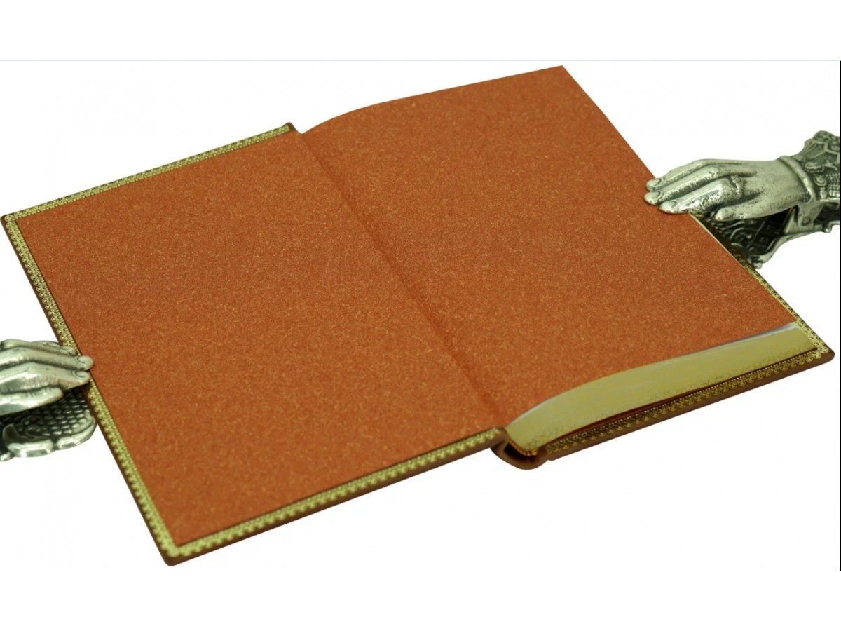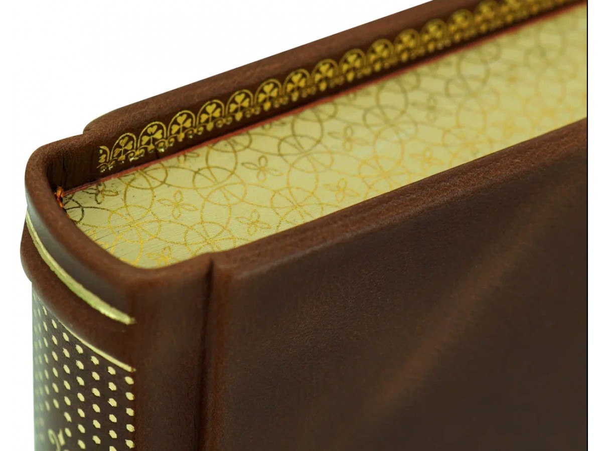Переплет ручной работы из натуральной кожи. Несколько видов тиснения: блинтовое и золотой фольгой. Трехсторонний тонированный обрез с золоченым узором. Дублюра. Форзацы из дизайнерской бумаги. Мелованная бумага. На корешке 6 бинтов. Каптал.