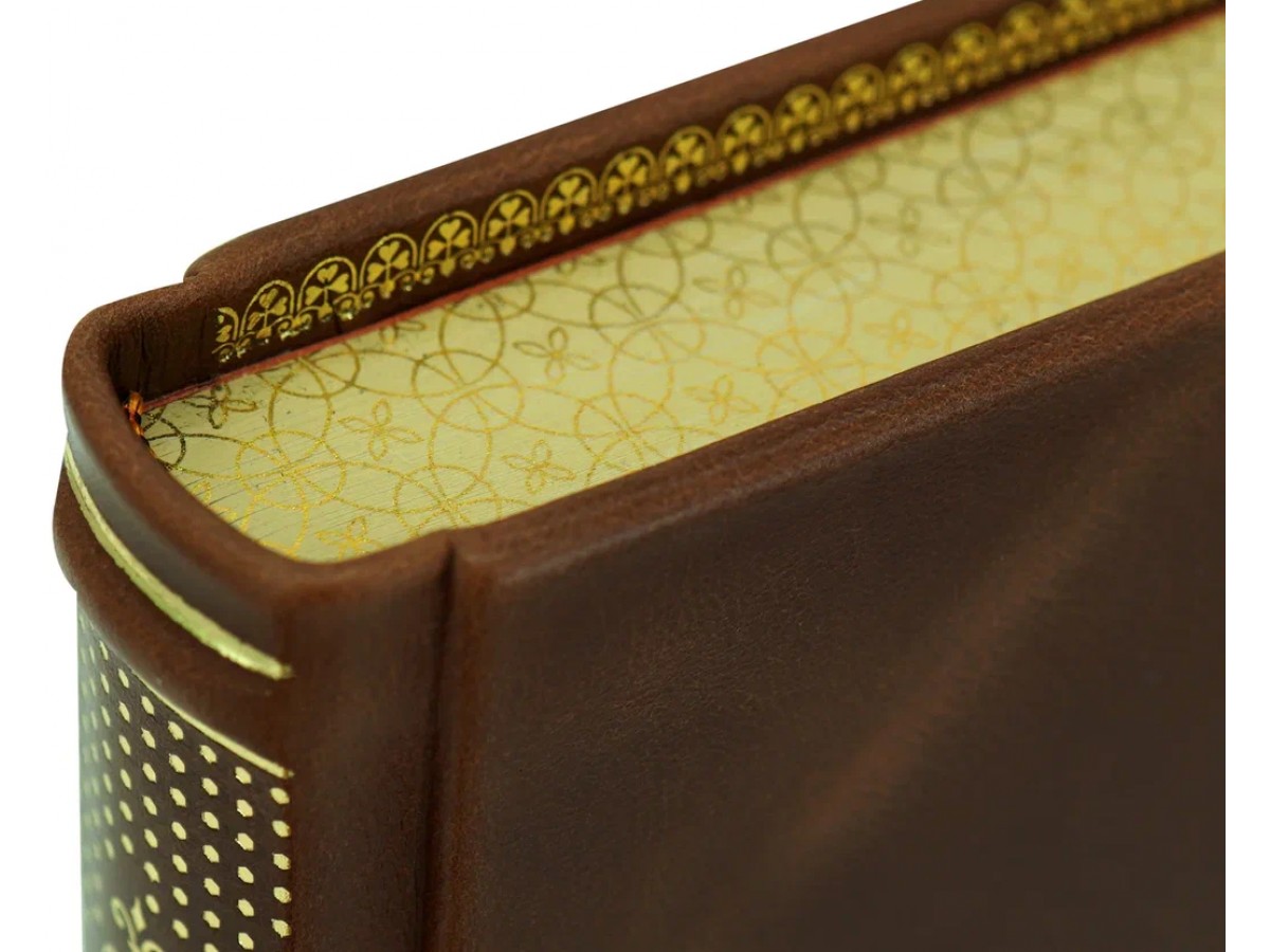 Переплет ручной работы из натуральной кожи. Несколько видов тиснения: блинтовое и золотой фольгой. Трехсторонний тонированный обрез с золоченым узором. Дублюра. Форзацы из дизайнерской бумаги. Мелованная бумага. На корешке 6 бинтов. Каптал.
