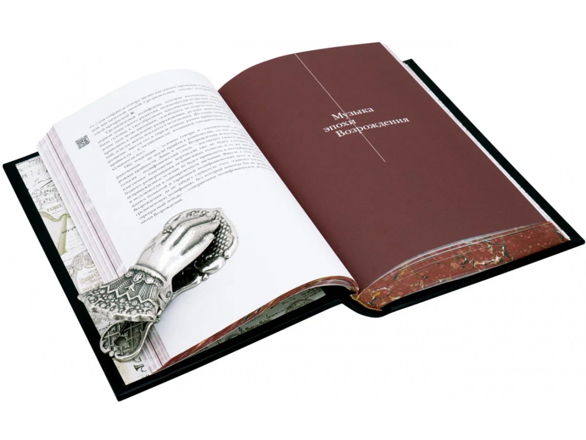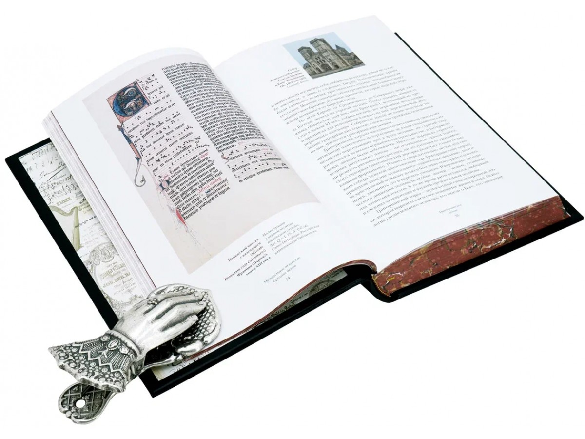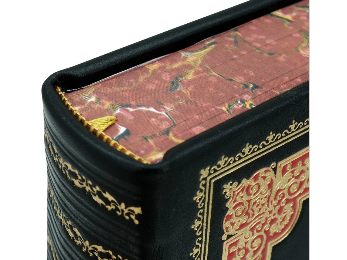 Кожаный переплет ручной работы. Два вида тиснения: блинтовое и цветной фольгой. Рисованный обрез. Шелковое ляссе.