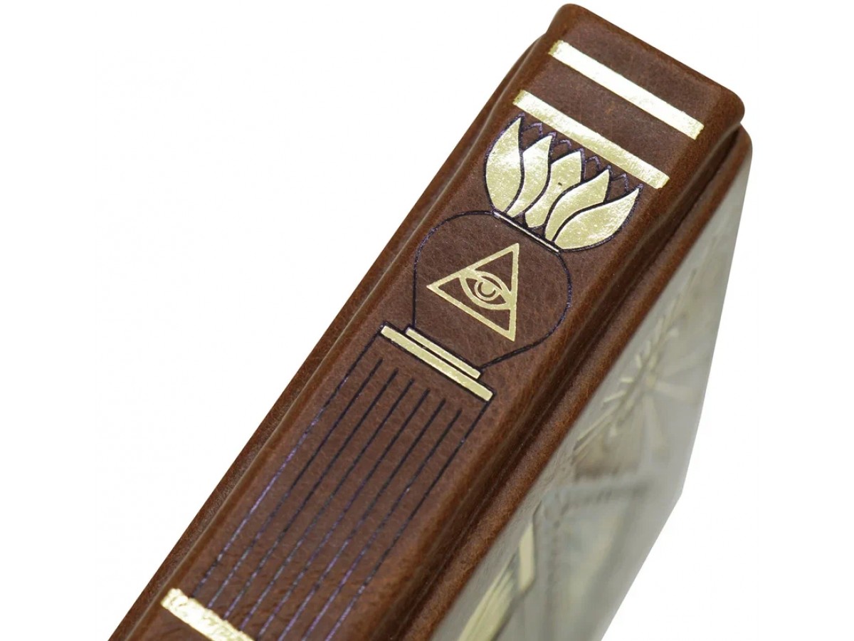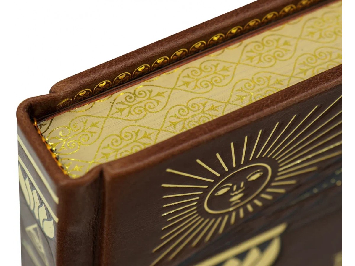 Переплет ручной работы из натуральной кожи. Несколько видов тиснения: блинтовое, золотой и цветной фольгой. Трехсторонний тонированный обрез с золоченым узором. Дублюра. Форзацы из дизайнерской бумаги. Мелованная бумага. Каптал.