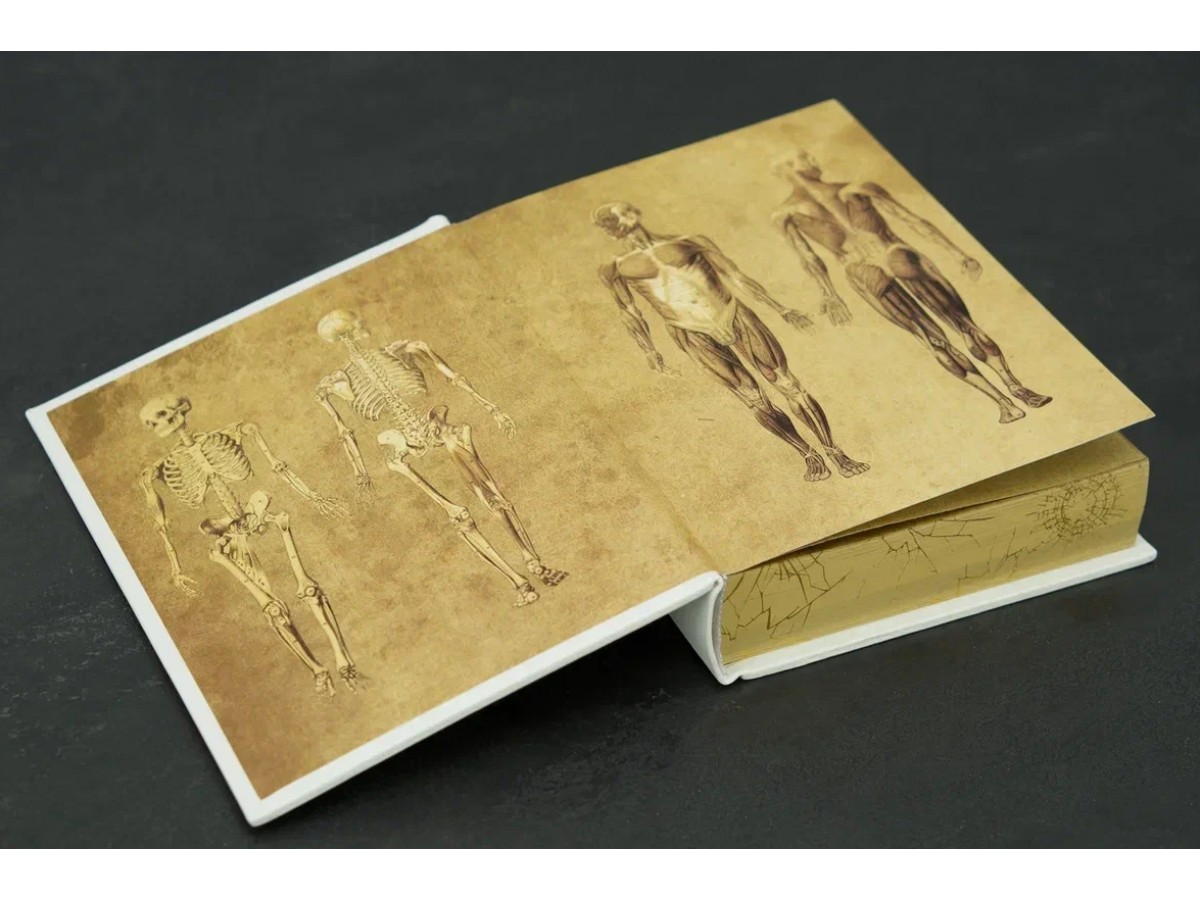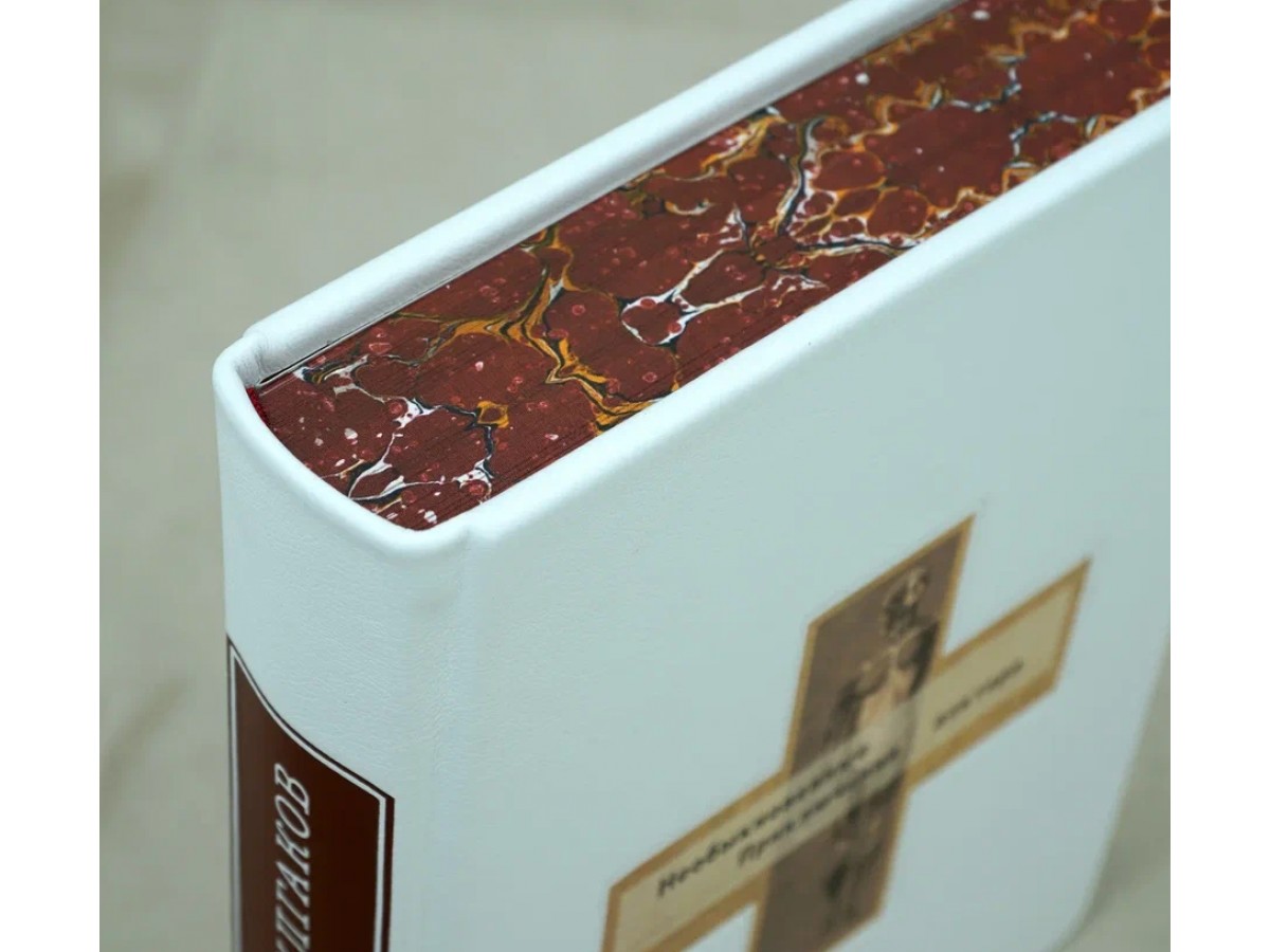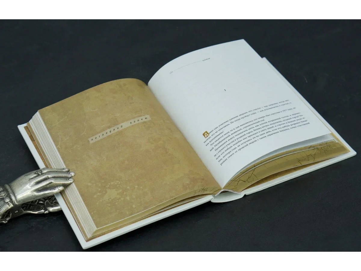 Кожаный переплет ручной работы. Блинтовое тиснение. Художественная накладка. Трехсторонний тонированный обрез с золоченым узором. Мелованная бумага. Форзацы из дизайнерской бумаги. Каптал.