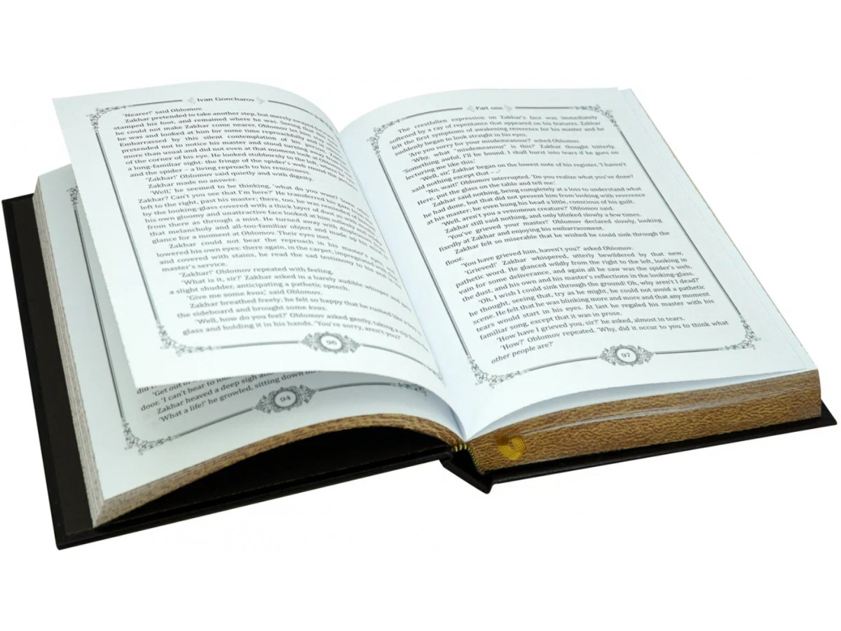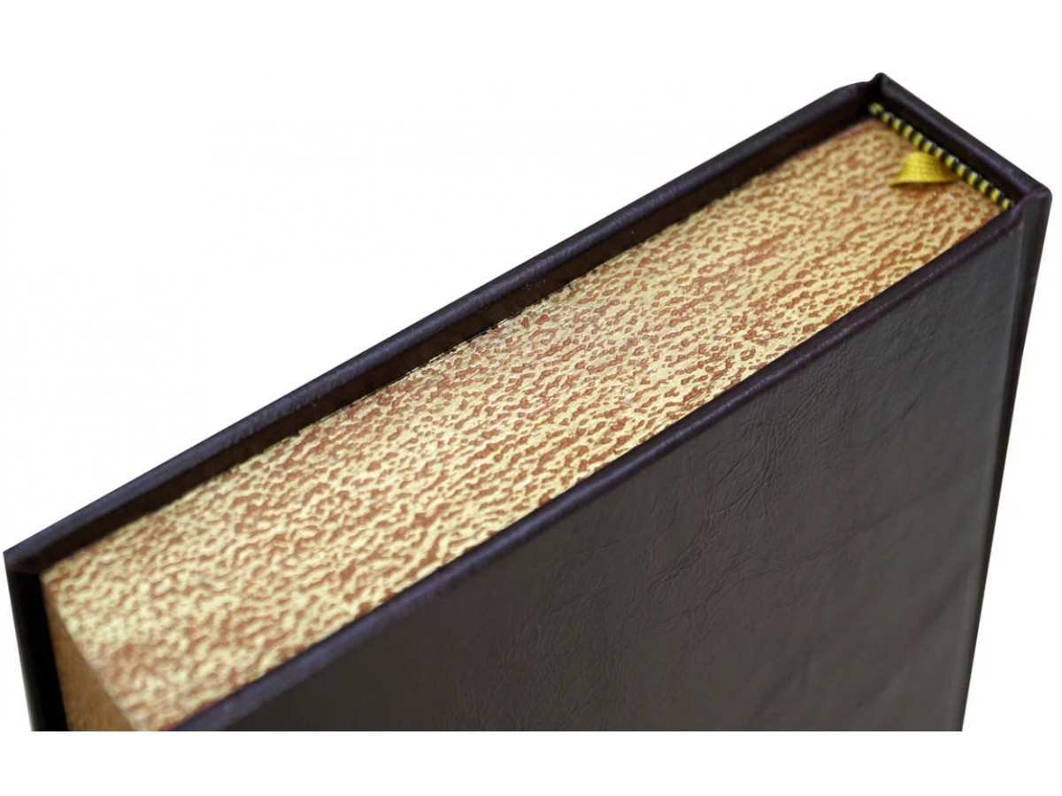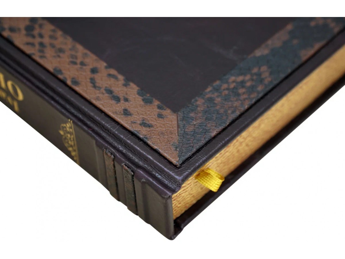 The French composite hand-made binding is made of a combination of genuine leather (leather "Gabinetto Brown", leather "Iguano" produced by the Italian tannery "Benericetti"). The cover of the book is decorated with relief gold embossing. Offset paper. The edge of the block is hand-polished and is made in the unique technique "Chameleon".