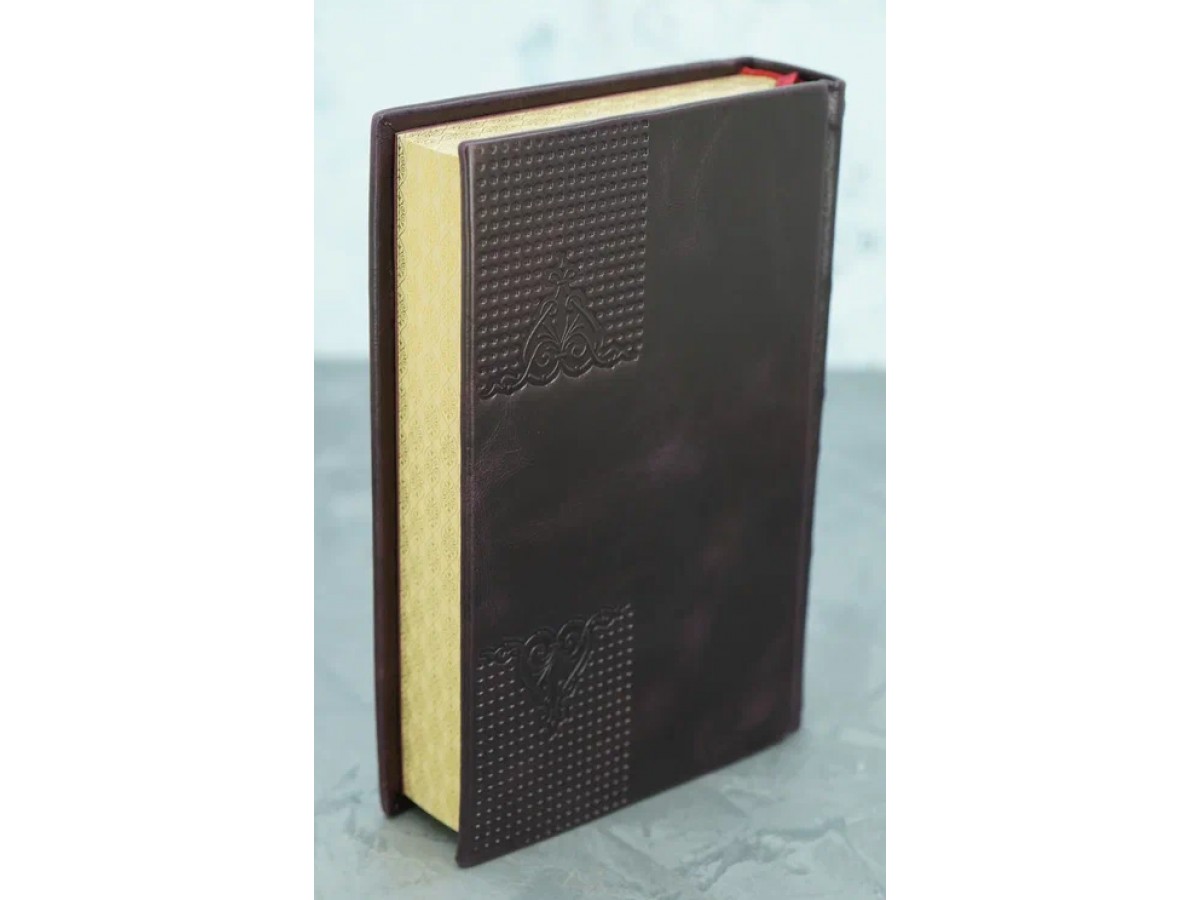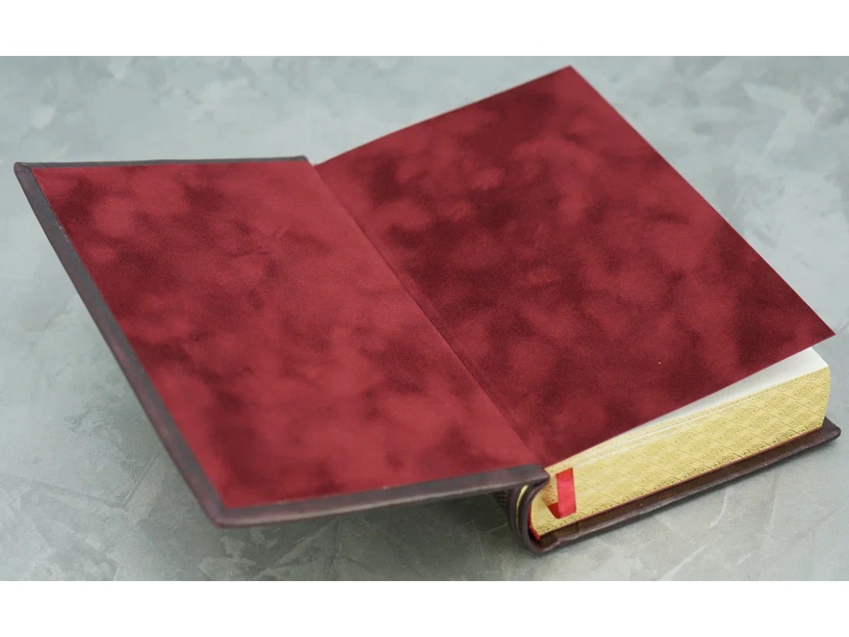 Кожаный переплет ручной работы, тиснение золотой фольгой.