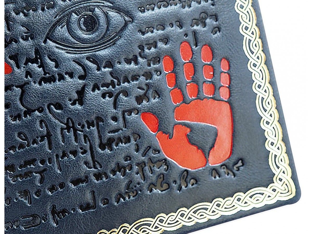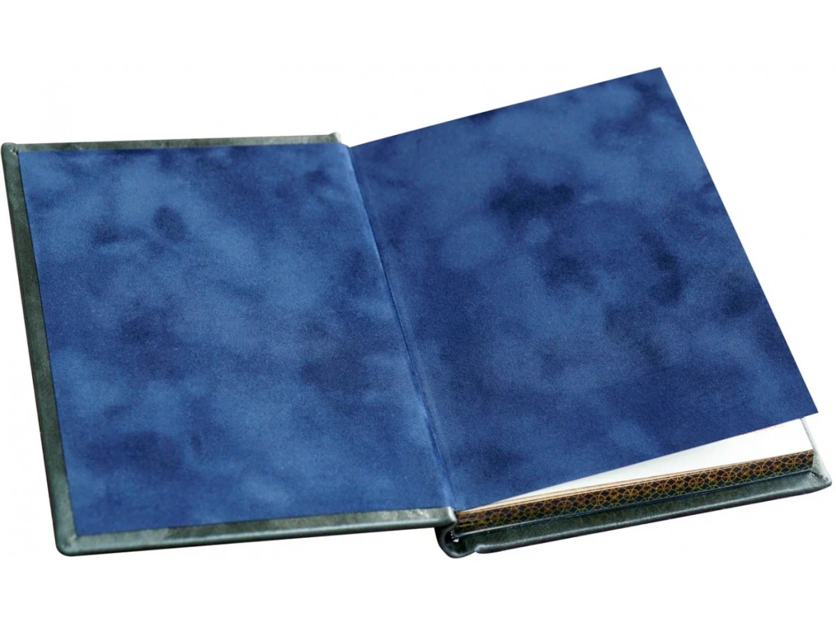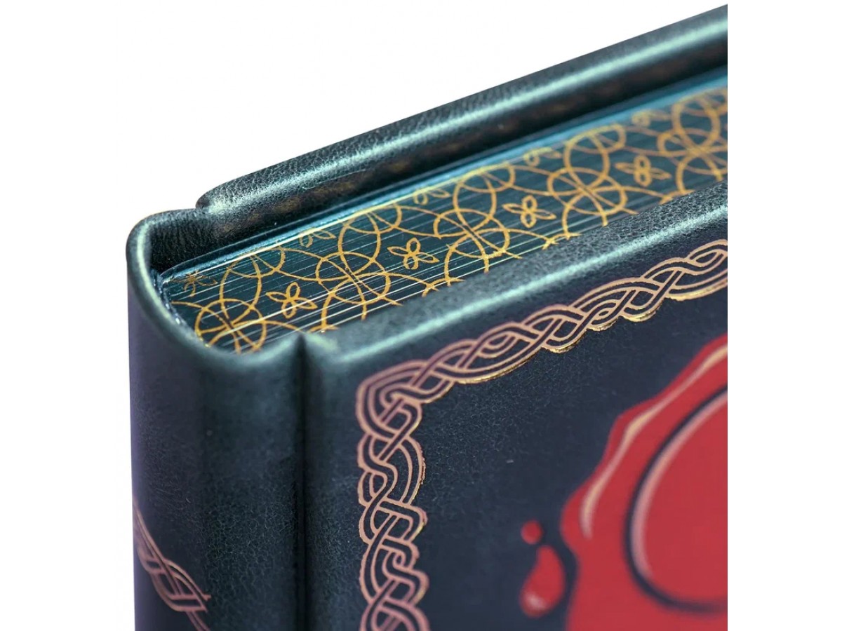 Переплет ручной работы из натуральной кожи. Несколько видов тиснения: блинтовое и золотой фольгой. Трехсторонний тонированный обрез с золоченым узором. Форзацы из дизайнерской бумаги. Каптал.