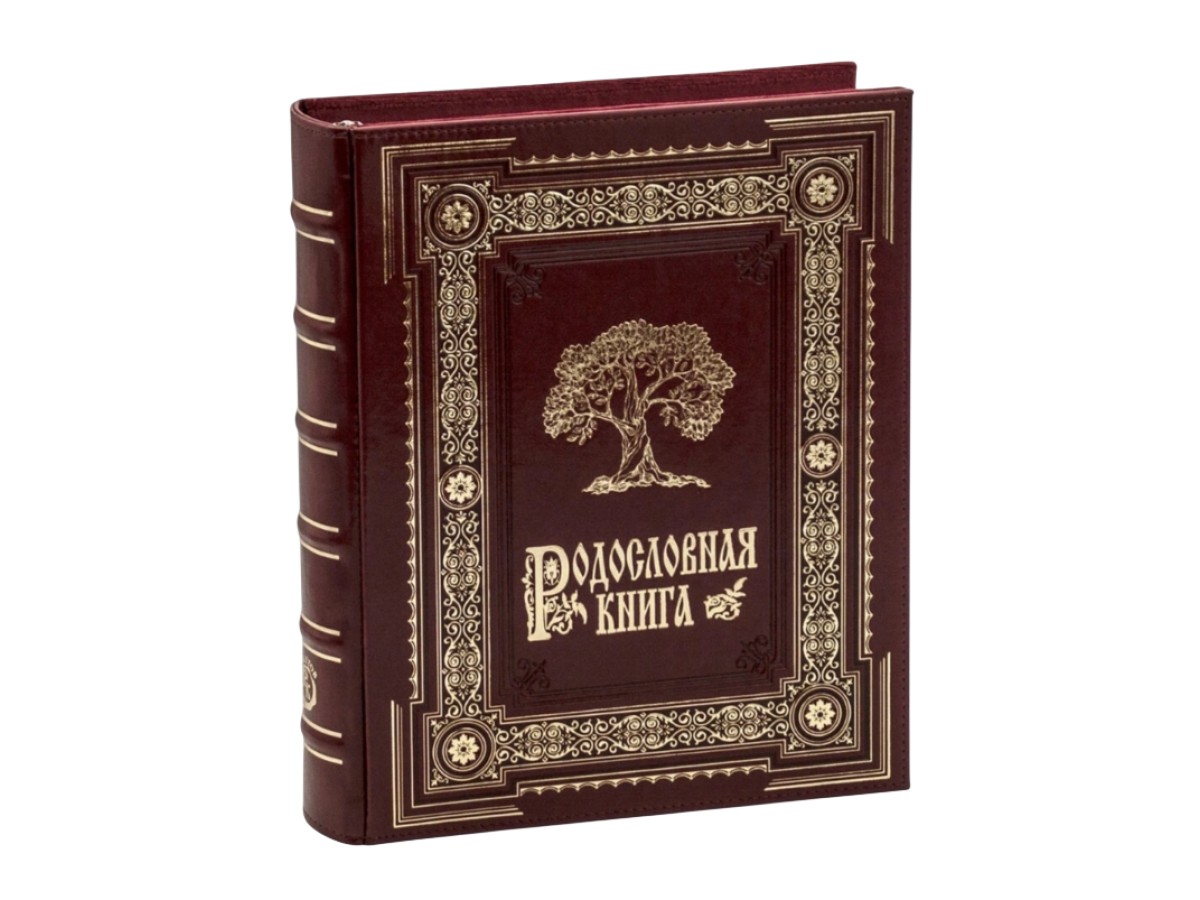 Переплёт родословной книги выполнен из пластин финского картона и вручную обтянут качественной экокожей. По всему периметру книги тиснение «золотой» фольгой, а также блинтовое тиснение (без фольги). На лицевой стороне обложка Родословной книги украшена изображением древа, выполненного тиснением золотой фольгой. Можно выбрать дизайн блока: Барокко (170 страниц) или Модерн (216 страниц). На цену покупаемой Вами родословной книги это не влияет.