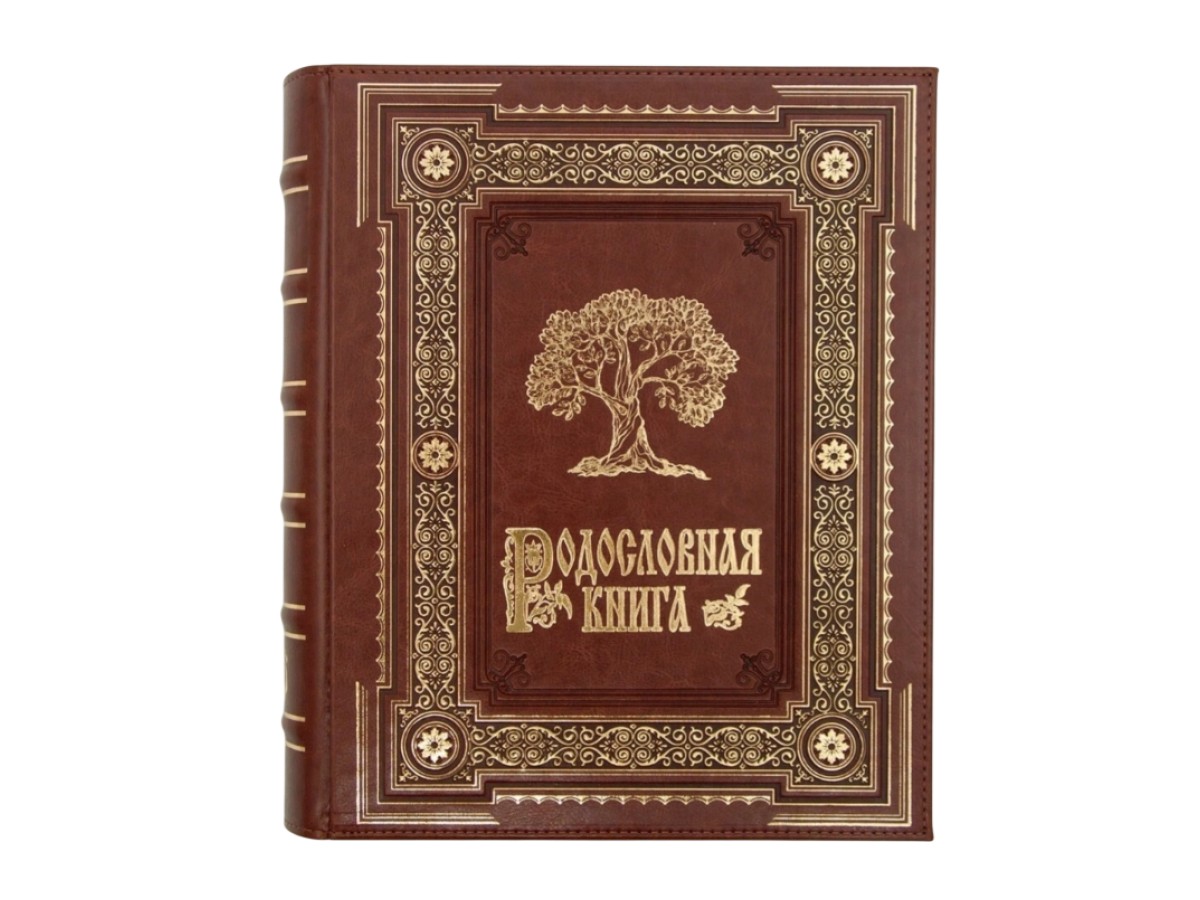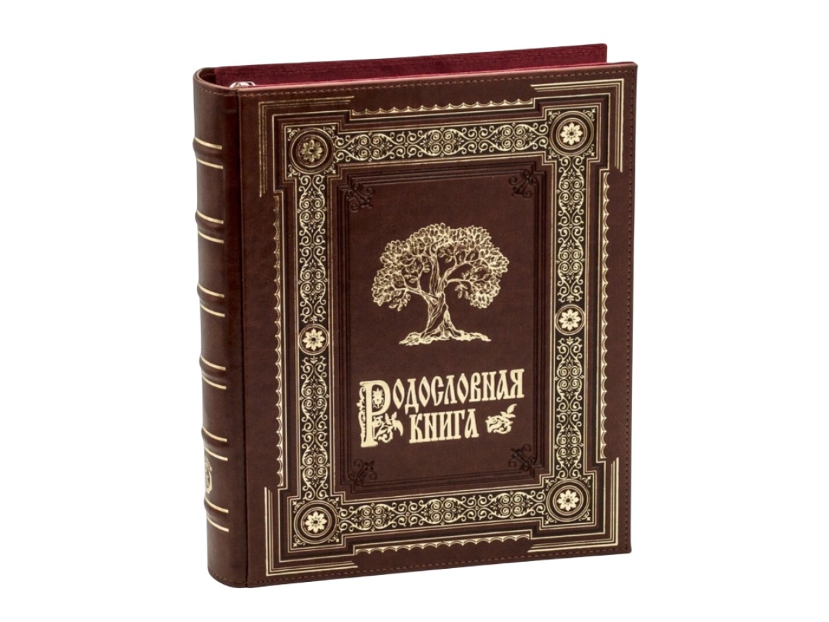 Переплёт родословной книги выполнен из пластин финского картона и вручную обтянут качественной экокожей. По всему периметру книги тиснение «золотой» фольгой, а также блинтовое тиснение (без фольги). На лицевой стороне обложка Родословной книги украшена изображением древа, выполненного тиснением золотой фольгой. Можно выбрать дизайн блока: Барокко (170 страниц) или Модерн (216 страниц). На цену покупаемой Вами родословной книги это не влияет.