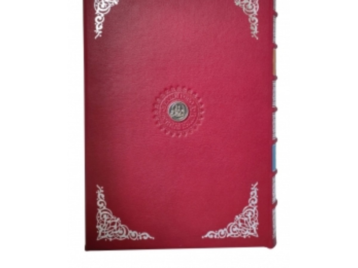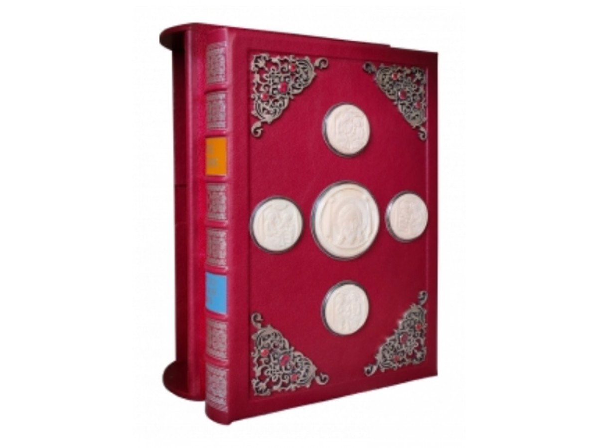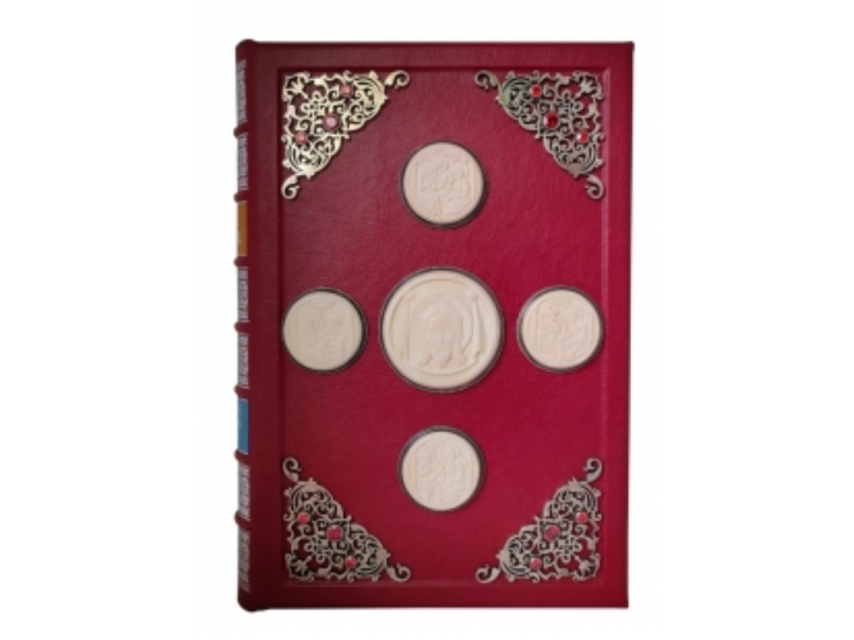 Самое красивое издание «Евангелия» за последние 100 лет на церковнославянском и русском языках. Книга издана ограниченным тиражом, макет выполнен в стиле классических богослужебных книг XIV—XV веков. В соответствии со старинными технологиями при оформлении иллюстративных элементов использована полноцветная печать с включением не только золотой пасты, но и сусального золота — редкость в мировой полиграфии. Уникальная сортовая бумага, сложная текстовая печать (офсет, тиснение, лакировка, шелкография), ручная вклейка иллюстраций — все в книге соответствует уровню дорогих «подносных» изданий. Часть тиража оформляется в стиле палехской иконописной школы, другие экземпляры — в стиле «царских изографов» мастеров Оружейной палаты времен царя Алексея Михайловича. Печать в 4 краски, печать золотой пастой, печать золотом 24 карата. Бумага книжного блока - Hello silk mat 200 gr (Zanders - Germany). Французский цельнокожаный переплет ручной работы на трех шнурах. Кожа «шагрень-атлас», бордовый (фирма Рельма, Франция). Форзац раздельный на кожаной слизуре. Каптал шелковый ручного плетения. Тиснение серебряной фольгой. Обрез окрашенный и полированный. Художественная рельефная резьба по моржовому зубу (Архангельск). Ювелирные украшения переплета - серебро 925 пробы, чернение, общий вес 335 грамм. Цветные фианиты.